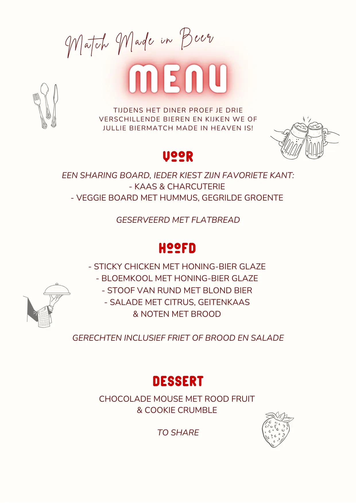 Zijn jullie elkaars hoppen en mouten? Tijdens dit speciale diner inclusief Oersoep-bierproeverij ontdek je welke biersmaak het beste bij jou past… en of die toevallig hetzelfde is als die van je geliefde! Ondertussen geniet je van een heerlijk driegangendiner van onze Chef. Een avond vol verrassingen, proostmomenten én een vleugje Valentijnsmagie.